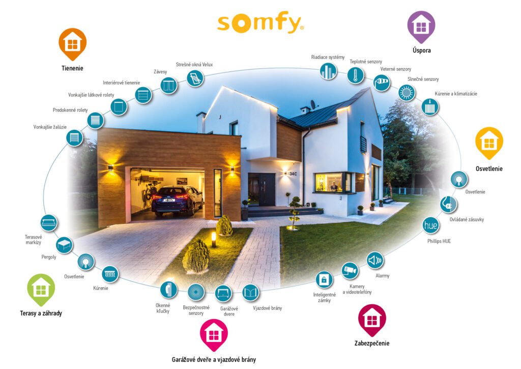 Stačí jediné kliknutie vo vašom mobilnom telefóne a žalúzie, rolety a ďalšie tienenie, ale aj osvetlenie, garážové brány a vjazdové brány sa okamžite prispôsobia vášmu požiadavku. Presne to ponúka automatizácia domácnosti od nášho partnera – spoločnosti Somfy.
